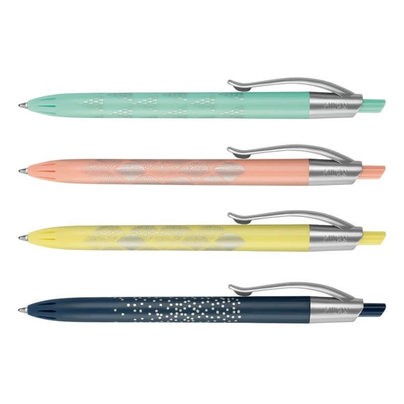 Estuche flexible que contiene 4 bolígrafos P1 Silver con el cuerpo del mismo color de la tinta: azul, amarillo, rosa y verde.